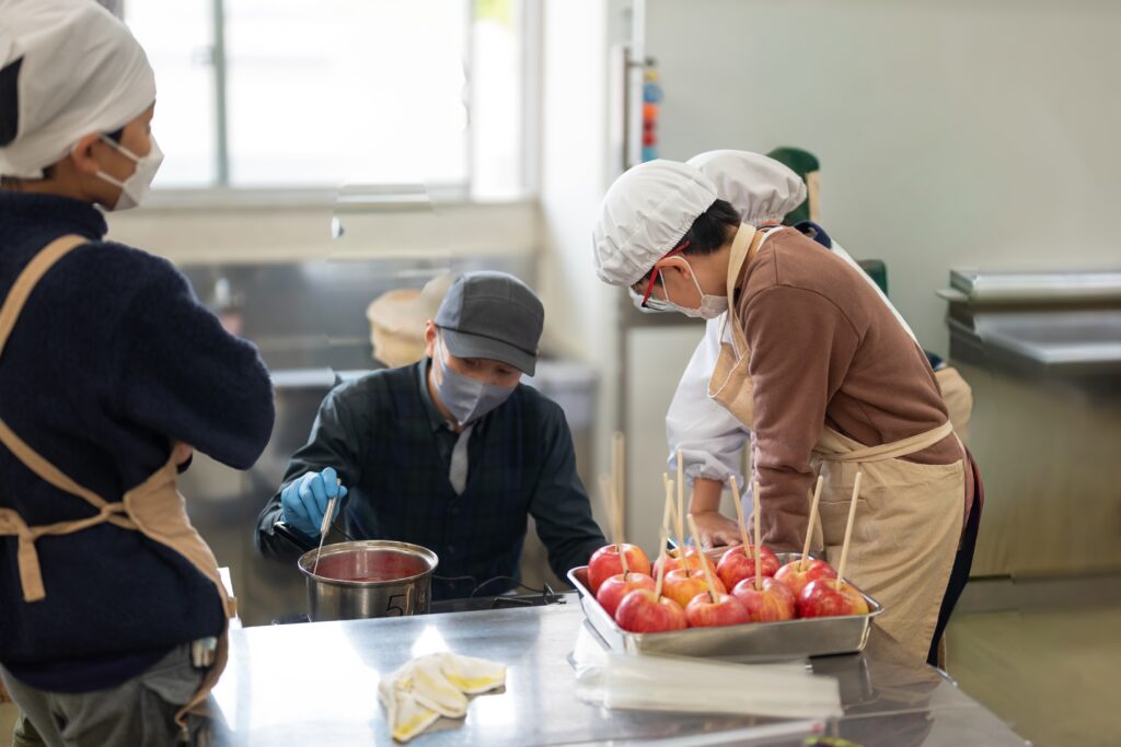 小学校では、りんご飴づくりの体験と規格外品の活用や農家支援に関する学びを組み合わせたプログラムを実施。